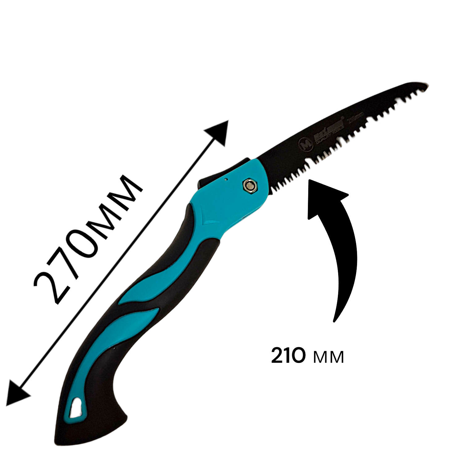 Удобная универсальная складная ножовка от "Maximum Quality Tools" имеет 3D заточку зубьев и специальную кнопку блокировки лезвия.