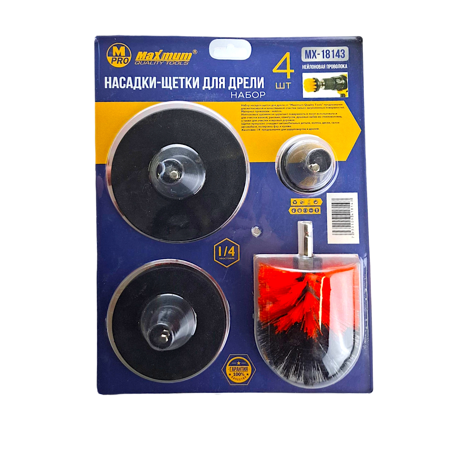 Набор нейлоновых щеток-насадок от "MAXIMUM" — это популярное и практичное решение для множества задач по очистке и обработке поверхностей. Это комплект из четырех нейлоновых щеток, предназначенных для установки в электроинструмент с вращающимся патроном: дрель, шуруповерт или специализированную щеточную машинку. Их главная особенность — шестигранный хвостовик 1/4" (6.35 мм), который является стандартом для быстрозажимных патронов и позволяет мгновенно менять насадки без использования ключа.